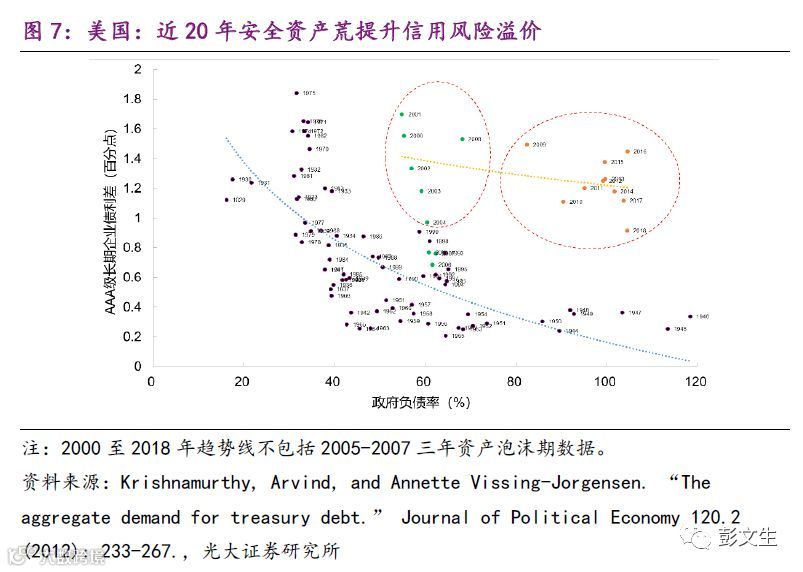 有什么证据支持安全资产荒的逻辑?图7描述的是美国政府债务率与企业债信用利差的关系。从1920年代到2000年之前,两者的关系显示,随着政府负债率增加,企业信用利差在降低,这是因为国债供给增加满足了人们对安全资产的需求,使得人们更愿意持有风险资产,企业债信用利差下降。这是JPE这篇文章提出的解释,符合安全资产供求平衡影响信用风险溢价的逻辑。