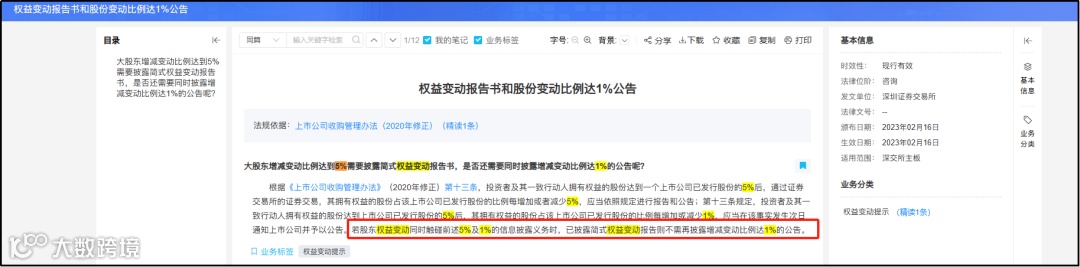 说到这里,我们再讲讲关于这两种计算的起算点,变动1%的公告起算点就是自上次披露1%的公告之后起算,5%的公告起算点就是自上次披露5%的公告之后起算,如果还未披露过相关的权益变动公告,那就是上市之日的持股比例起算。那如果1%和5%是同时触发的,那下一次1%的起算点就可以按照变动5%披露的权益变动报告书的变动后比例作为起算点。