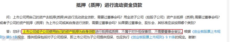 进行抵押或质押,不属于对外担保事项,可参考下图深交所咨询易的问答。