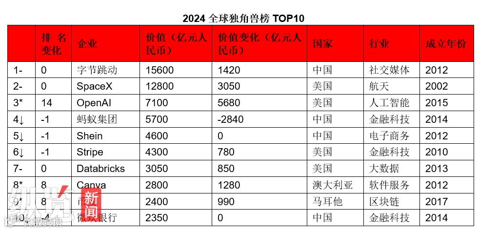 4月9日,胡润研究院发布《2024全球独角兽榜》,列出了全球成立于2000年之后,价值10亿美元以上的非上市公司。中国4家独角兽企业进入前十,其中,字节跳动以价值1.56万亿元,继续位列排行榜第一。河北有四家企业上榜,分别是京西智行、君乐宝、同光晶体、坤天新能源。