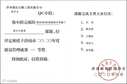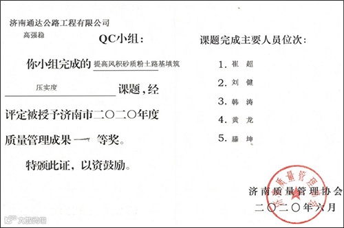 其中,一等奖2项,分别是来自第三分公司的《提高风积砂质粉土路基填筑压实度》、第一分公司的《提高SMA沥青路面冬季施工渗水合格率》。