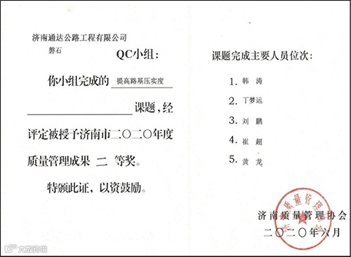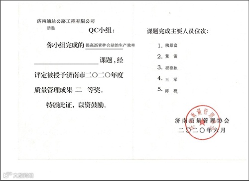 二等奖4项,分别是来自研发中心的《提高沥青拌合站的生产效率》、四川项目部的《提高连续刚构桥悬臂施工混凝土外观质量合格率》、第四分公司的《沥青路面压实度监控》、第三分公司《提高路基压实度》。