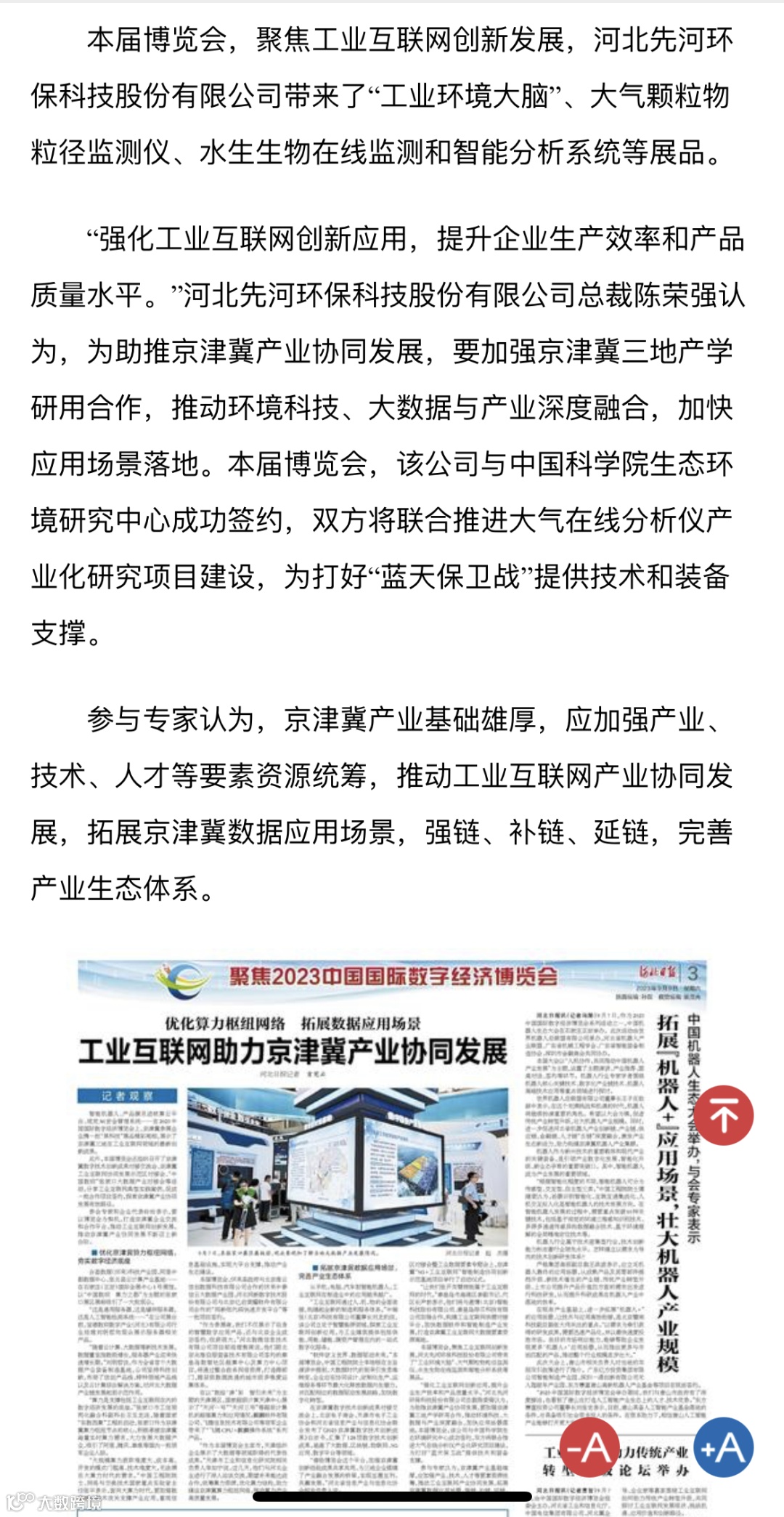 河北日报报道了先河环保在拓展京津冀数据应用场景,完善产业生态体系领域方面做出的贡献。文中提到,先河环保聚焦互联网创新发展,推出创新产品的同时,加强京津冀三地产学研用合作,推动环境科技、大数据产业深度融合,加快应用场景落地。与中国科学院生态环境研究中心成功签约,双方将联合推进大气在线分析仪产业化研究项目建设,为打好“蓝天保卫战”提供技术和装备支撑。