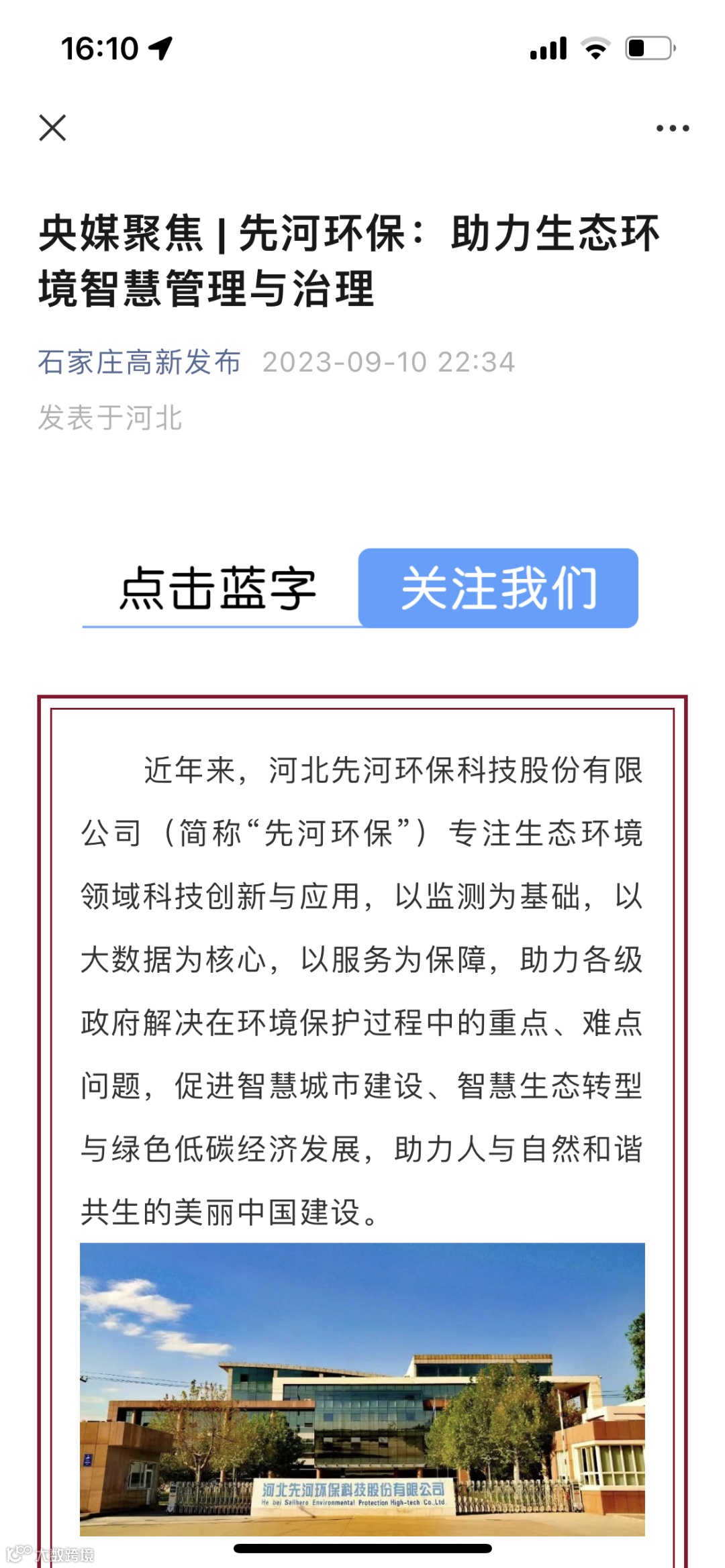 人民日报、河北日报、河北新闻网、石家庄日报、石家庄电视台等主流媒体对先河环保科技研发、智慧管理与治理、创新增效、推动京津冀协同发展等工作亮点进行了报道,政府官方媒介、各大网络融媒体同步转载报道,展示了企业良好形象。