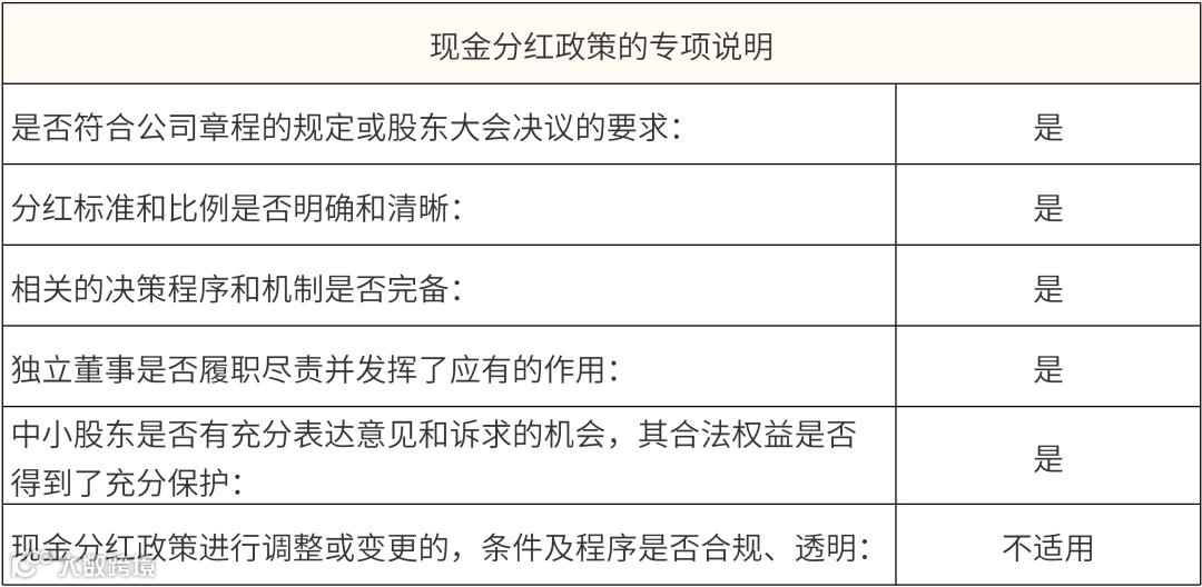根据年报准则第三十六条规定,公司应当披露报告期内利润分配政策,特别是现金分红政策的制定、执行或调整情况,说明利润分配政策是否符合公司章程及审议程序的规定,是否充分保护中小投资者的合法权益,是否由独立董事发表意见,是否有明确的分红标准和分红比例;以及利润分配政策调整或变更的条件和程序是否合规、透明。应当披露报告期内现金分红政策的制定及执行情况,并对下列事项进行专项说明:(一)是否符合公司章程的规定或者股东大会决议的要求。……(五)中小股东是否有充分表达意见和诉求的机会,中小股东的合法权益是否得到了充分保护等。