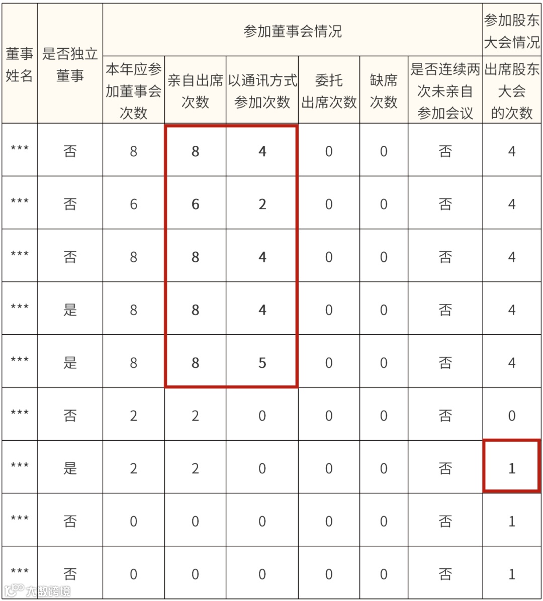 在本部分需要注意的是上表参加董事会情况中董事亲自出席次数加上委托出席次数再加上缺席次数之和需与本年应参加董事会次数相等。表格中董事以通讯方式参加董事会次数应当小于或等于亲自出席董事会次数。以通讯方式参会也属于亲自出席会议。另外,报告期内如有更换董事的情况,需注意分别统计并核对更换前后的董事参加董事会及股东大会的情况,防止出现错漏。