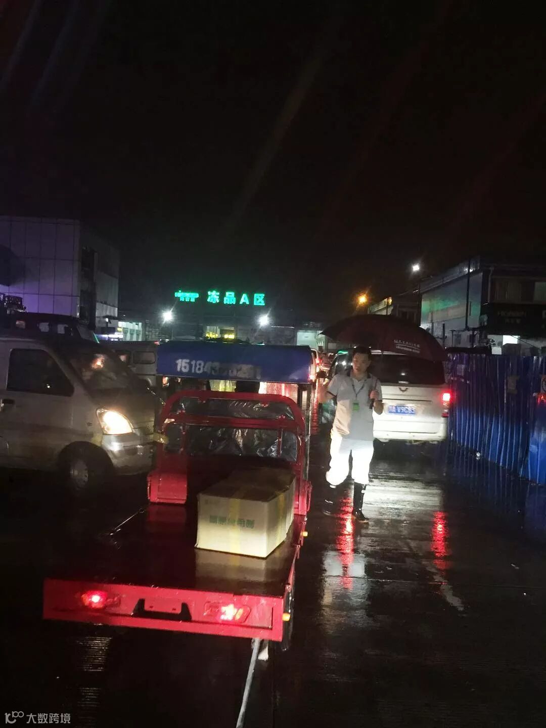 市场内一个个忙碌的身影不停地穿梭,车辆来来往往,在这风雨交加的夜晚,黄宗均一直站在暴雨中疏导交通。