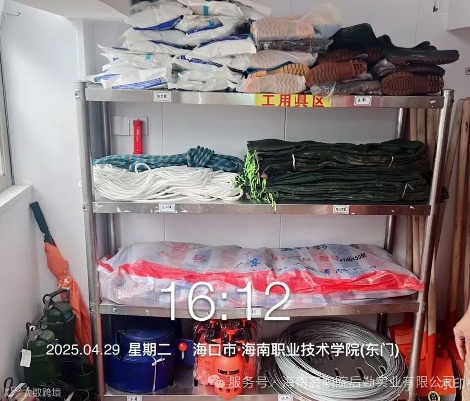 为确保学校安全度汛,海南高职院后勤实业有限公司提前采购了一批防台防汛物资,确保一旦发生汛情,能够迅速响应,有充足的物资保障抢险救援工作顺利开展。