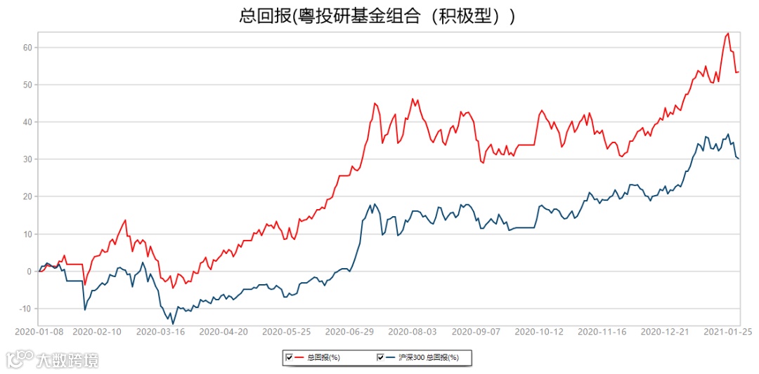 粤投研积极型基金组合累计上涨53.35%,同期沪深300指数上涨30.15%,跑赢沪深300指数23.21%。2020年1月9日-2021年1月29日,数据来源:Wind。