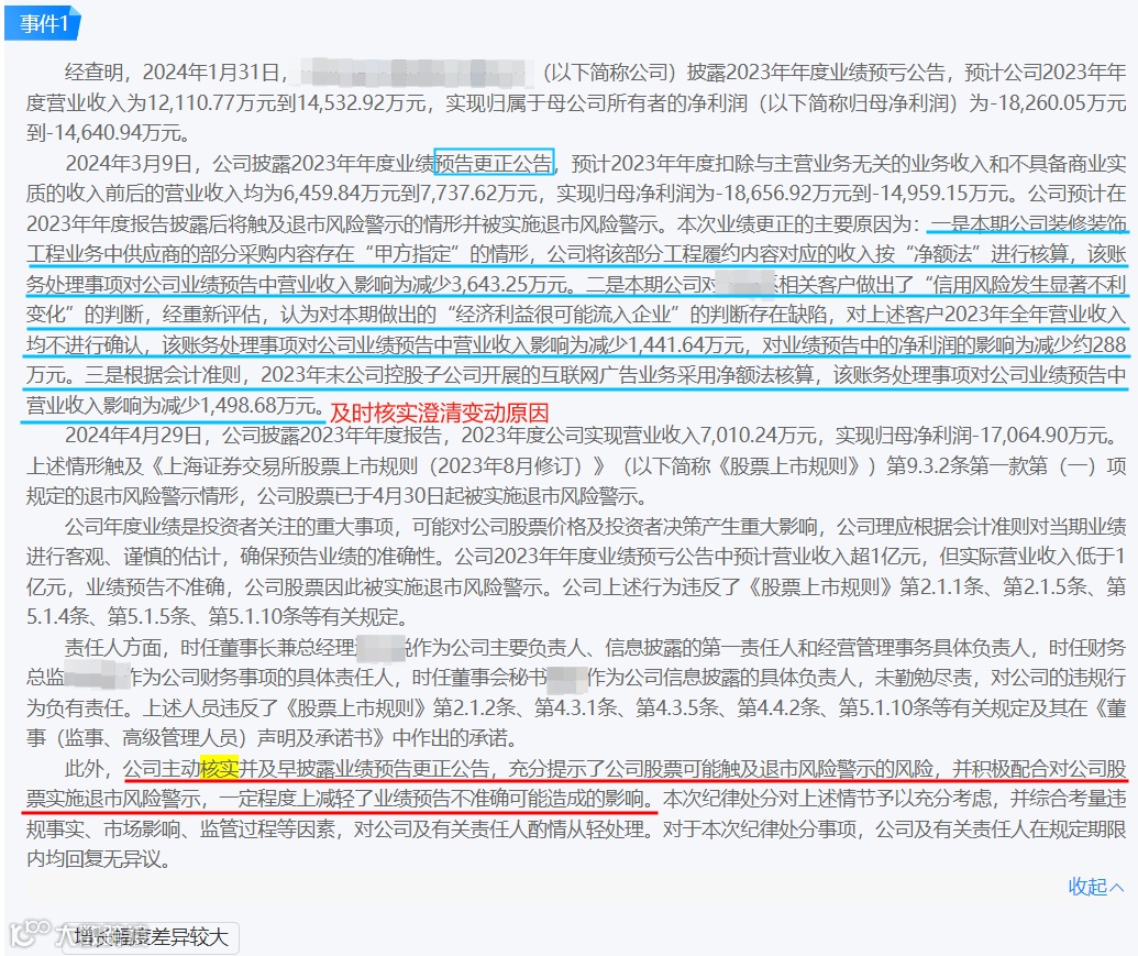 上市公司披露业绩预告后,如预计本期经营业绩或者财务状况与已披露的业绩预告存在重大差异的需进行披露(“重大差异”包含但不限于以下情形): 1、预告盈亏性质、方向错误; · 具体表现为:先预盈,实际亏损;先预亏,实际盈利;先预减,实际增长或亏损;先预增,实际下降或亏损。 2、差异金额或幅度达到20%以上; · 业绩预告披露金额或比例的,预计本期业绩与预告业绩差异幅度达到20%以上; · 披露“以上”的,预计本期业绩上浮达到20%以上; · 但如披露区间的,预计本期业绩超出区间(上下限之间不应超过50%); · 披露“左右”的,预计本期业绩上下浮动达到20%以上。 3、已披露的业绩预告内容不明确或者附加了条件,而预计本期业绩出现盈亏或与去年相比出现大幅变动的,如仅指明盈亏方向但目前可以确定预计本期业绩的大致盈亏数额(例如,原来只是预计亏损目前可以确定亏损5000万元以上,或者原来只是预计可以扭亏目前能够确定盈利3000万元以上)的,也应披露业绩预告更正公告。 4、因《上市规则》)第6.2.1条第一款第四项、第五项情形披露业绩预告的,最新预计不触及第6.2.1条第一款第四项、第五项的情形。 5、因《上市规则》第6.2.3条情形披露业绩预告的,最新预计的相关财务指标与已披露的业绩预告发生方向性变化的,或者较原预计金额或者范围差异较大。 6、本所规定的其他情形。 |