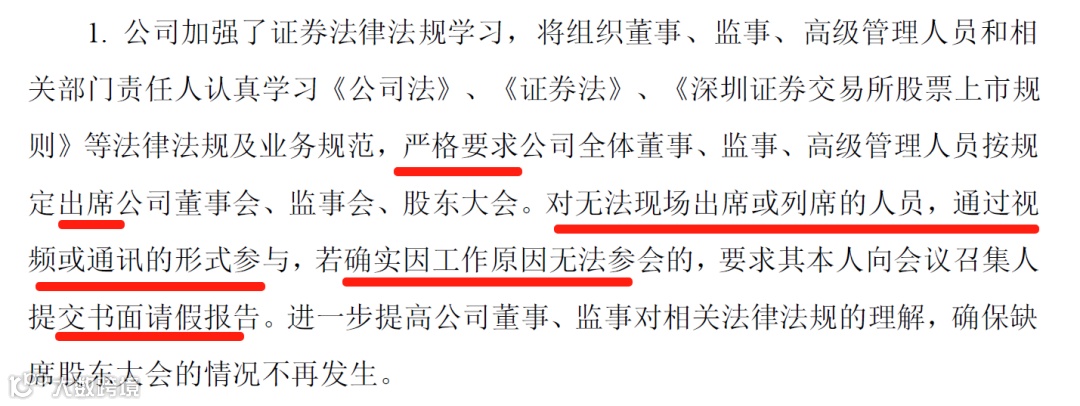 2023年12月28日,深主板上市公司披露《关于深圳证监局行政监管措施决定的整改报告》,上市公司同样存在部分董事、监事、高管未按规定出席的情况。在整改措施中,公司提到:无法出席现场的,通过视频或通讯形式参与,确有情况无法参会,提交书面请假报告。