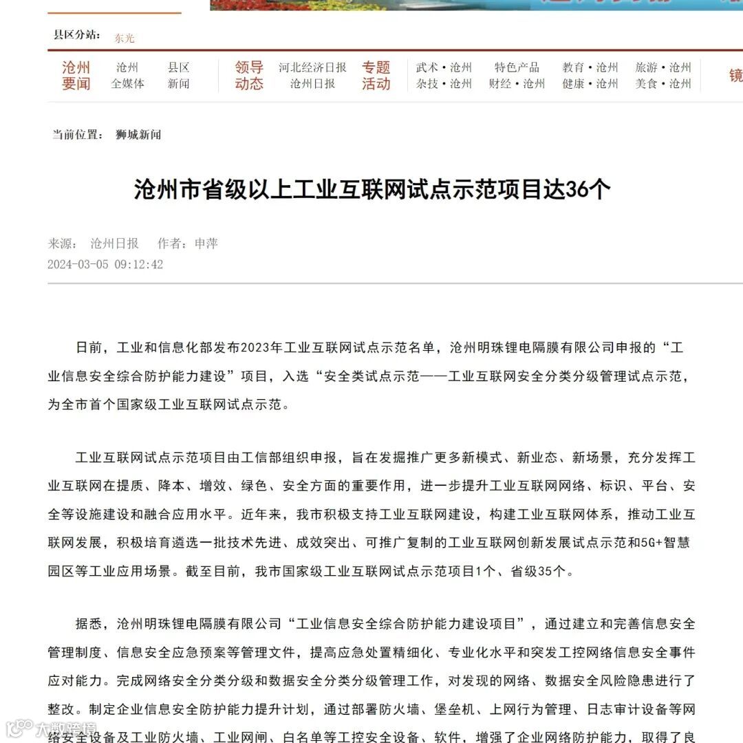 近日,在工业和信息化部公布的《关于2023年工业互联网试点示范名单的公示》中,沧州明珠锂电隔膜有限公司“工业信息安全综合防护能力建设项目”成功入选“安全类试点示范——工业互联网安全分类分级管理试点示范”名单,为沧州市工业互联网领域再添一项国家级荣誉。