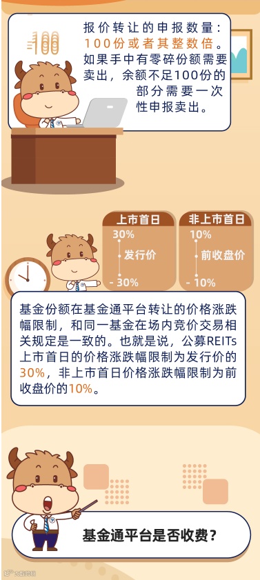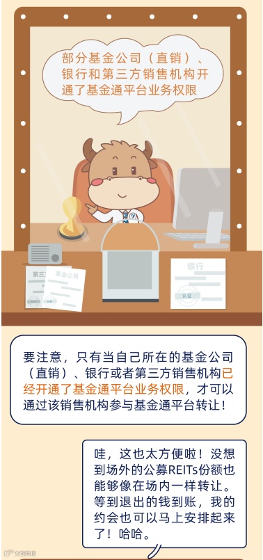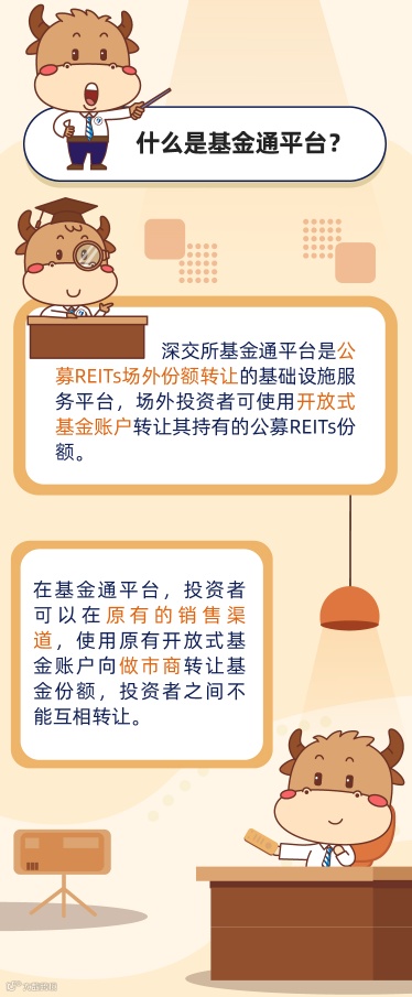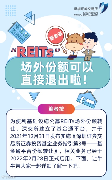 为便利基础设施公募REITs场外份额转让,深交所建立了基金通平台,并于2021年12月31日发布实施《深圳证券交易所证券投资基金业务指引第3号——基金通平台份额转让》,相关业务已经于2022年2月28日正式启用。