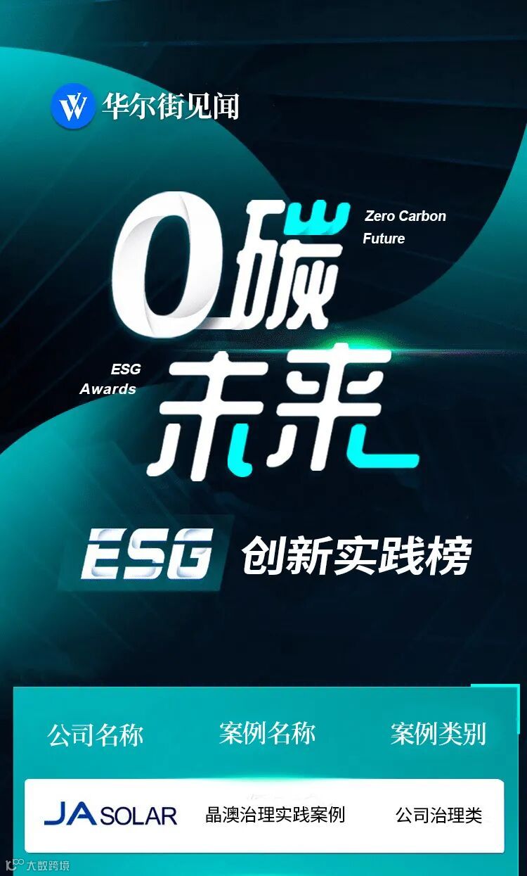 近日,第二届华尔街见闻“0碳未来· ESG创新实践榜”正式发布,晶澳科技凭借在ESG领域的创新实践和突出贡献,从众多企业中脱颖而出以“治理实践案例”荣登榜单。