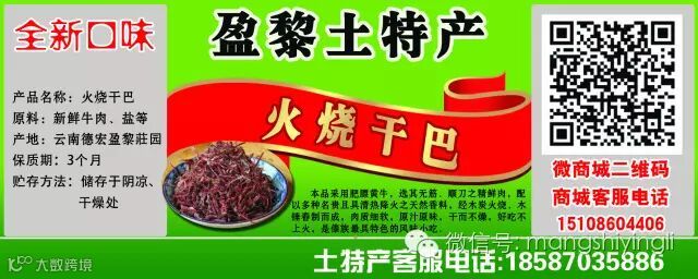 本品采用肥膘黄牛,选其无筋、顺刀之精鲜肉,配以各种名贵且具清热降火之天然香料,经木炭火烧,木槌舂制而成,肉质细软、原汁原味、干而不燥,好吃不上火,是傣族最具特色的风味小吃。