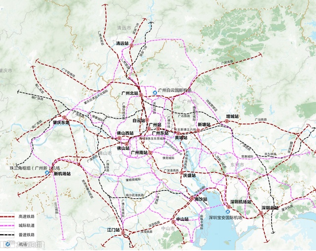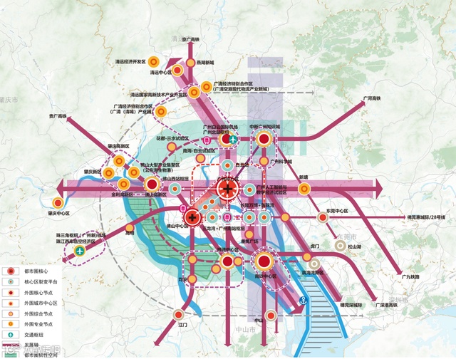 以广佛为核心规划形成13条、6向的高效对外高速铁路通道。推动佛穗莞城际、芳白城际、广花城际及其北延线、南珠中城际、肇清从城际的建设;建设国际航运枢纽。强化佛山港、肇庆港、清远港、云浮新港、韶关港功能,优化沿江码头布局,建立健全水运协调发展机制。