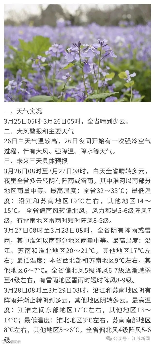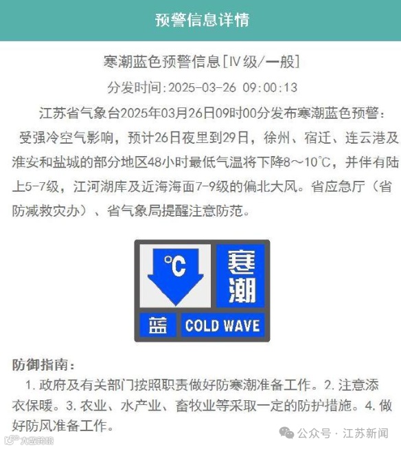 受强冷空气影响,预计26日夜里到29日,徐州、宿迁、连云港及淮安和盐城的部分地区48小时最低气温将下降8℃~10℃,并伴有陆上5-7级,江河湖库及近海海面7-9级的偏北大风。