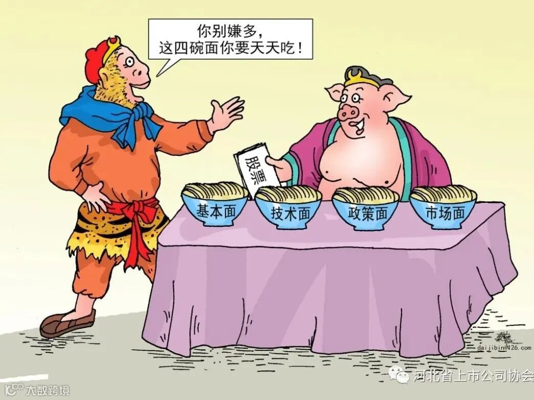 投资股市、分析股票,有很多研究维度、分析技巧和方法。结合本期栏目的漫画作品,我们来聊聊这“四碗面”:政策面、基本面、市场面和技术面。