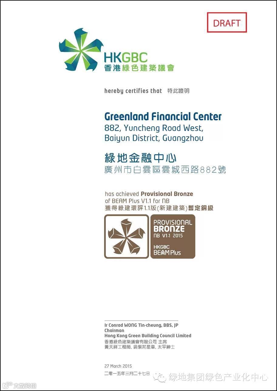 绿地集团从安全可靠、成本经济、节能环保,以及可持续发展理念出发,充分考虑各节能系统的可行性,从细节着手,最大程度考虑建筑商业价值。通过利用可再循环材料建楼,并充分运用全玻璃幕墙系统、置换式新风系统、新风热回收系统和雨水回收系统等高性能的节能技术,从采光、通风、换气、节水等多方面着手,尽可能为用户打造安全、舒适、无污染、高品质的生活娱乐、学习工作空间。
