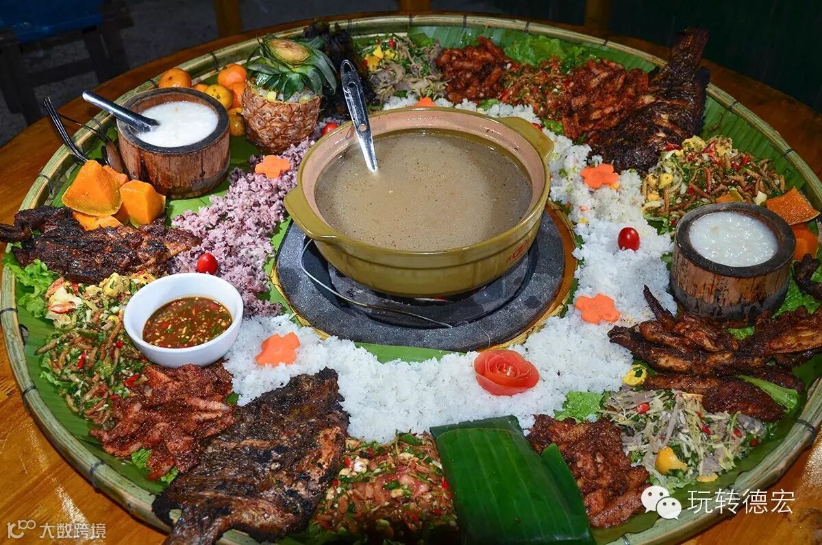 一桌看似简单的“火笼手抓饭”可谓色香味俱全:除了有景颇族特有的鬼鸡、包烧之外,还有干巴、竹虫、烧鱼、烧五层肉、素南瓜、凉拌鸡蛋、豆豉拌干笋等各种美味。