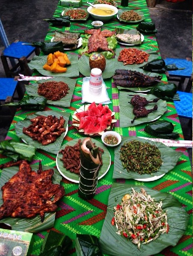全套的绿叶宴包括:烤鱼、舂干巴、糯米饭。鱼腥草、包烧牛肉、凉拌鬼鸡、烤鸡翅、炸五花肉等。味道鲜美独特,色香味俱全的美食不觉让你吃得酣畅淋漓。