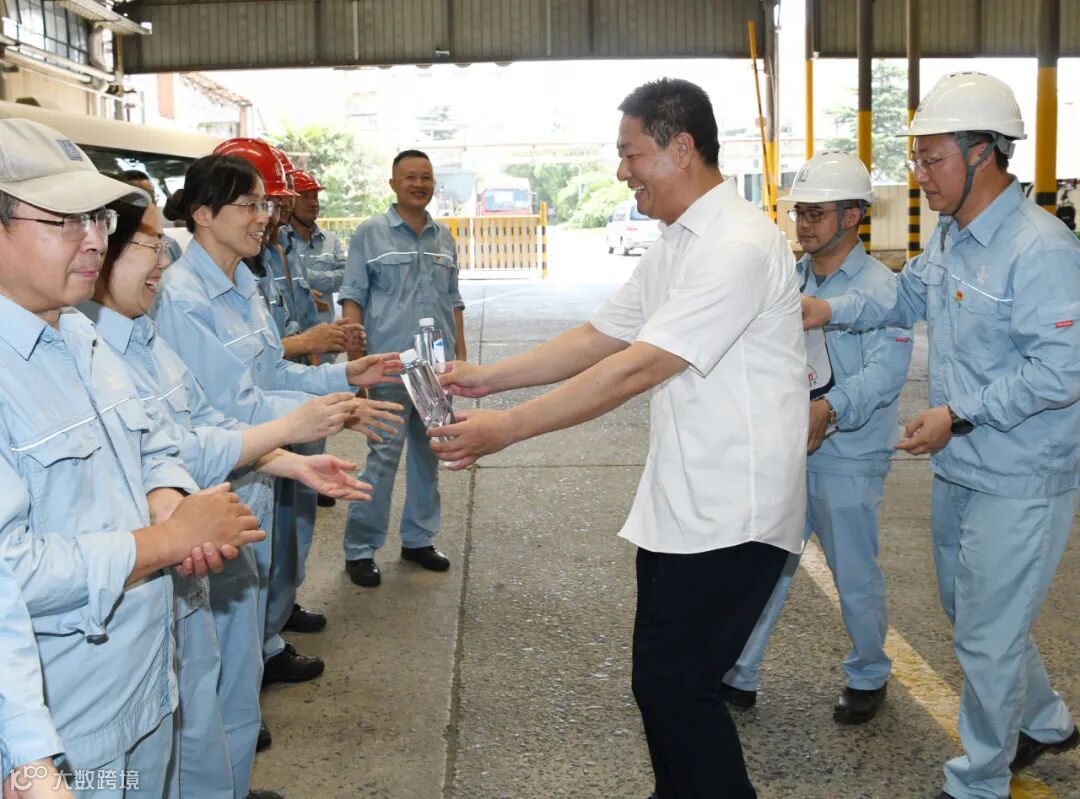 7月31日上午,扬州市总工会党组书记、副主席蒋元峰一行5人来到中国石化仪征化纤公司,在公司执行董事、党委书记郭晓军,公司党委副书记、工会主席刘楠的陪同下,看望慰问高温下辛勤工作的一线干部职工。