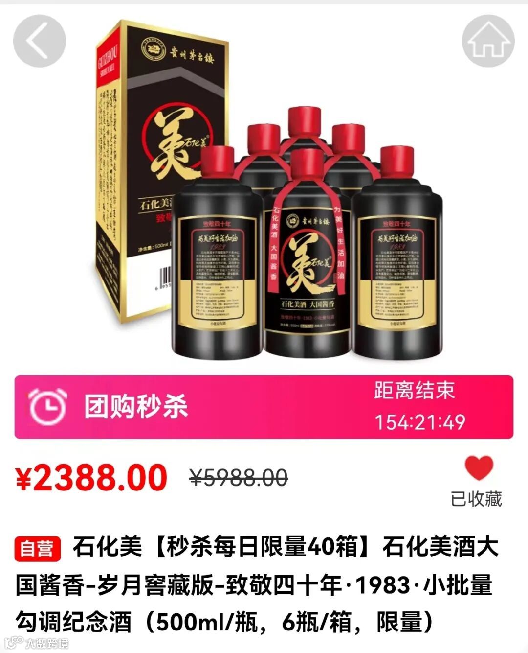 4月1日-7月12日,每天40箱,特惠秒杀100天!致敬四十年·1983·小批量勾调,“石化美”酒大国酱香岁月窖藏,为美好生活加油!赤水河谷出佳酿,茅台古镇石化美,茅台镇7.5平方公里核心产区,眼神的交流,握手的温度,分享正宗酱香的味道。