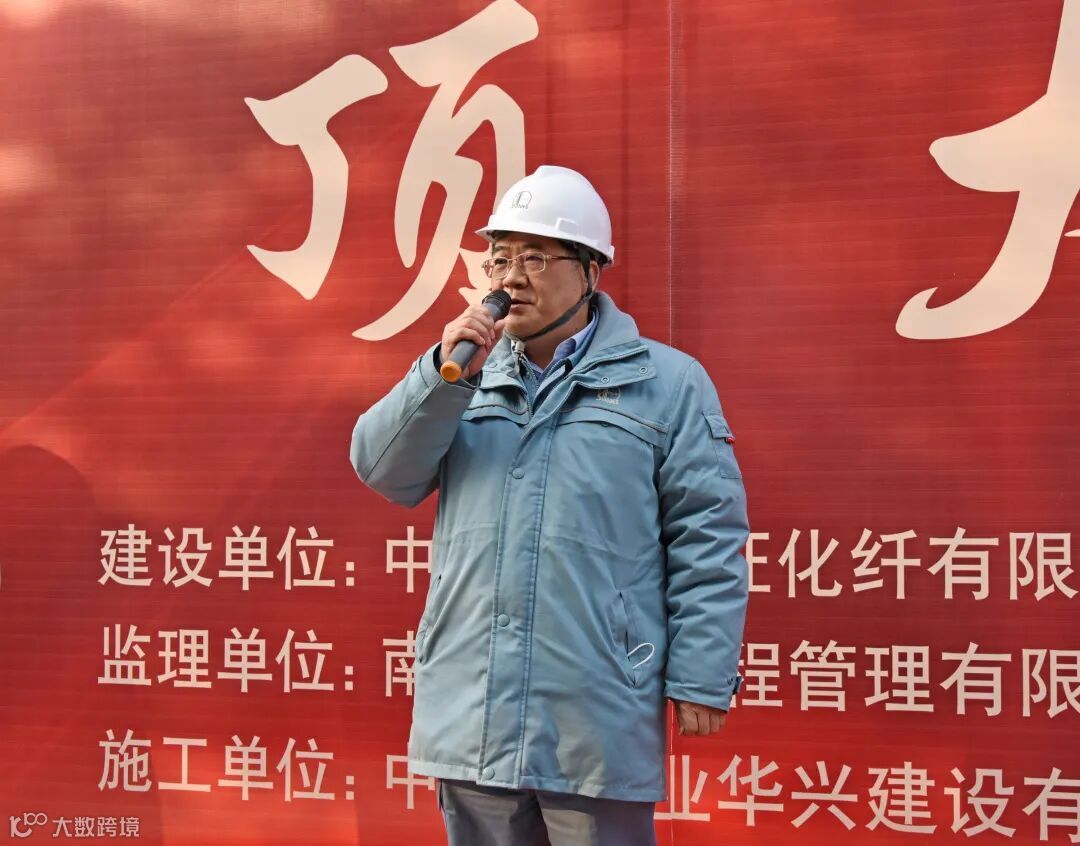公司副总经理刘建军宣布成功封顶。短纤项目管理部经理刘爱平代表项目管理部宣读感谢信。
