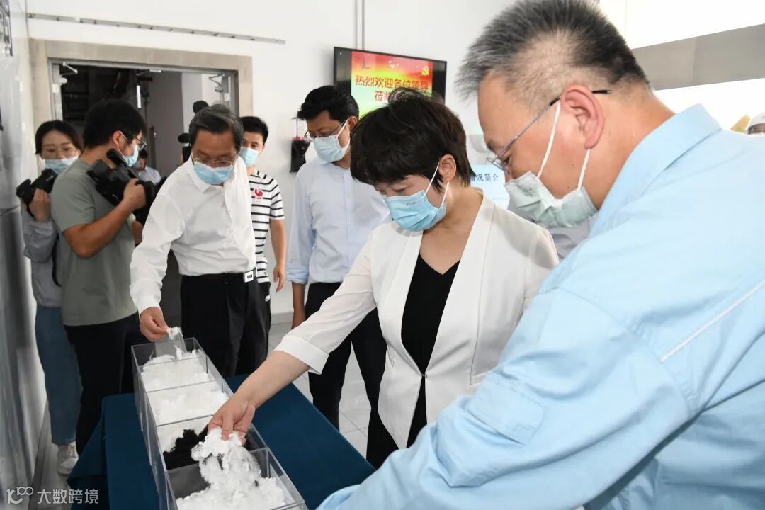 在装置纺丝生产现场,飞丝如瀑,比头发还细的原丝汇成一条条丝束,似流云疾涌而出,万涛向张宝娟、王进健一行介绍了纺丝生产工艺流程、原理、产品顶替进口等情况。