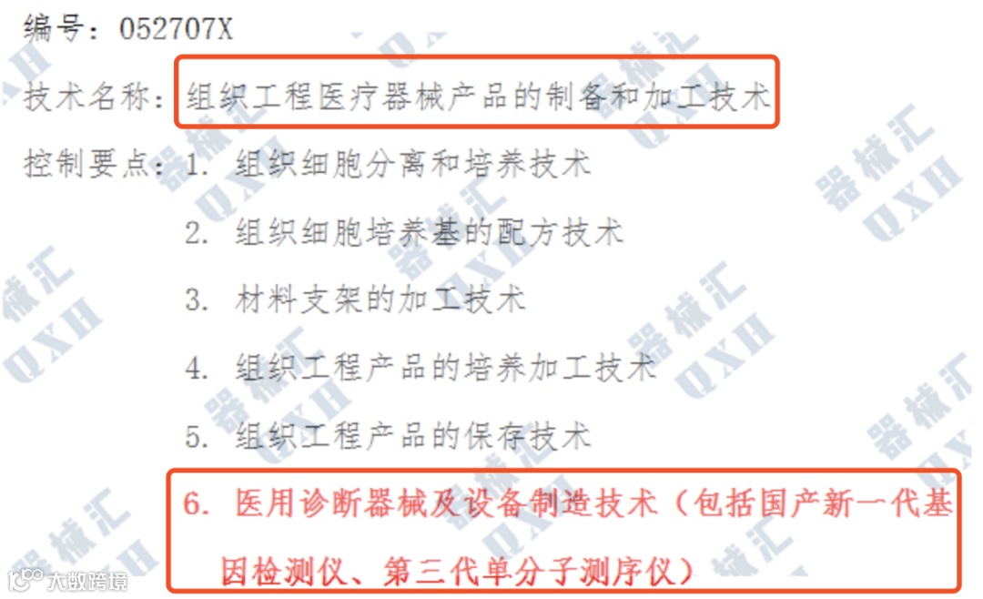 在组织工程医疗器械产品的制备和加工技术(编号:052707X)项下增加控制要点:“6. 医用诊断器械及设备制造技术(包括国产新一代基因检测仪、第三代单分子测序仪)”。