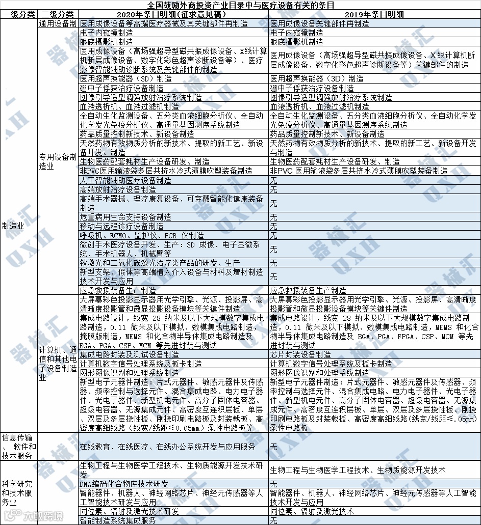 与2019年的全国目录相比,2020年的全国目录在医疗设备(及相关零部件)领域增加了13项条目: