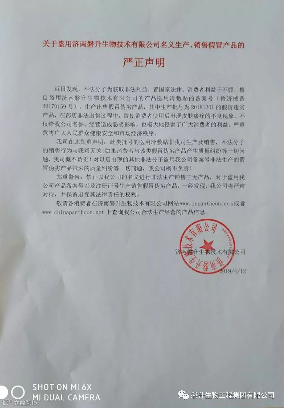 近日发现,不法分子为获取非法利益,置国家法律、消费者利益于不顾,擅自盗用济南磐升生物技术有限公司的产品医用冷敷贴的备案号(鲁济械备20170159号),生产出售假冒伪劣产品,其中生产批号为20181201的假冒违劣产品,在药店非法出售过程中,致使消费者使用后出现皮肤瘙痒的不良现象。不仅给我公司名誉、经营造成恶劣影响,也极大地侵害了广大消费者的利益,严重危害广大人民群众健康安全和市场经济秩序。