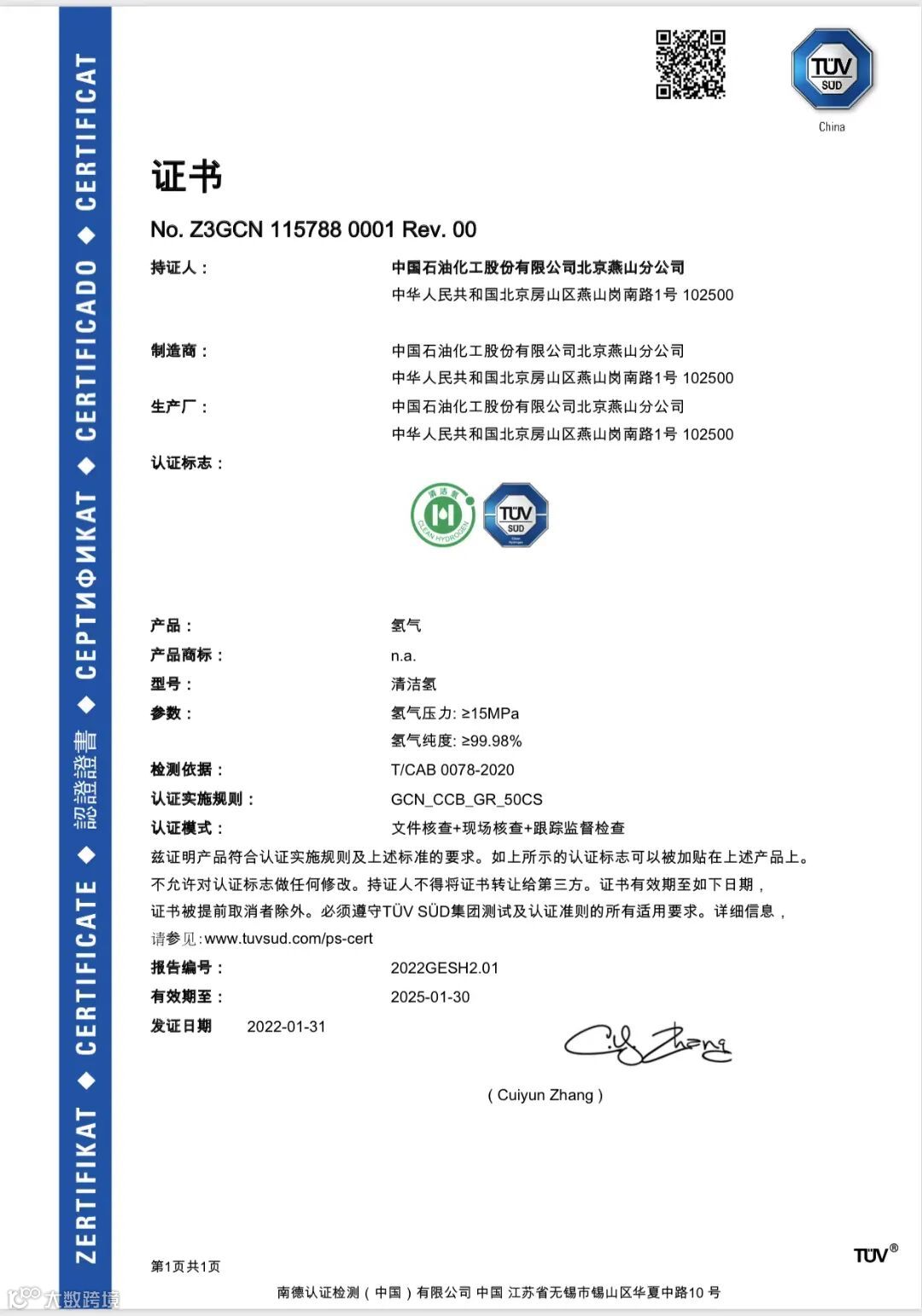 成为国内首家取得清洁氢认证的企业