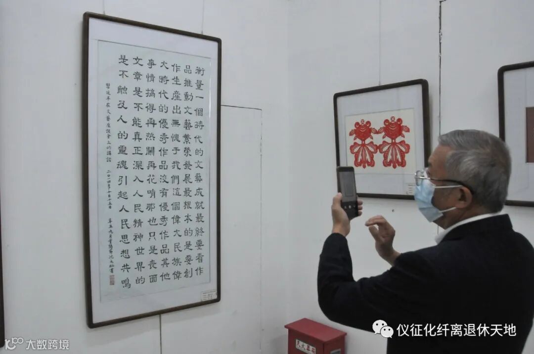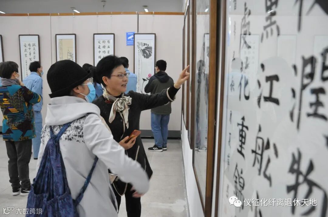陈达为展览揭幕后,兴致勃勃地观看了老同志们的书画和手工作品。在老年大学仪化校区主管陈金兰和老年大学书法老师周锡云的介绍下,陈达等领导逐幅观看欣赏,与作者亲切握手,和他们交流创作技艺和心得。
