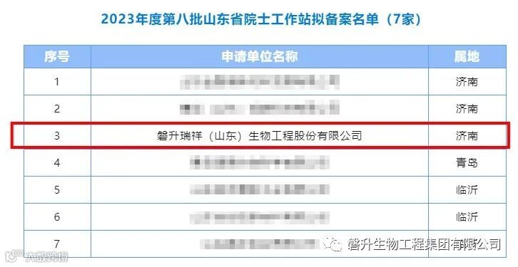 近日,山东省科技厅下发了《2023年度第八批山东省院士工作站备案公示(7家)》,磐升瑞祥(山东)生物工程股份有限公司成功备案省级院士工作站。此批次全市入围企业仅3家。