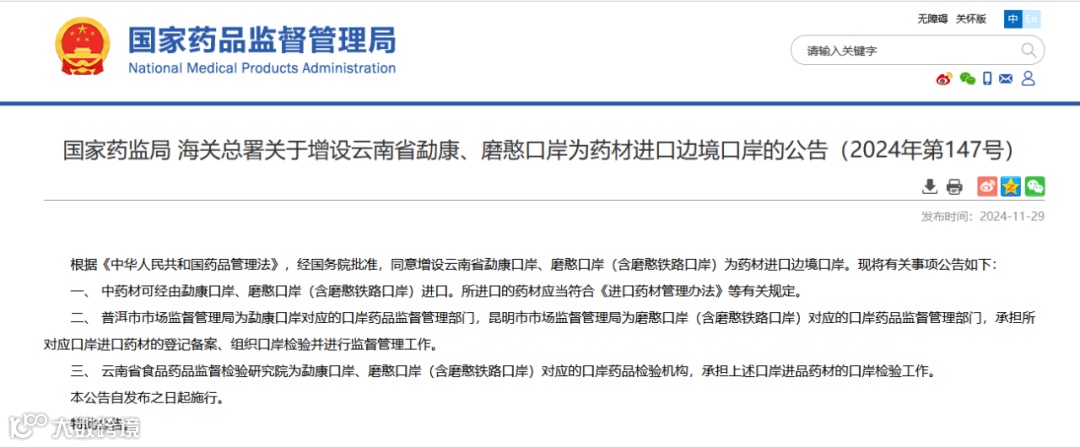 国家药监局 海关总署关于增设云南省 勐康、磨憨口岸为药材进口边境口岸的公告(2024年第147号)