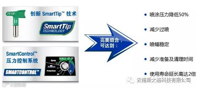 创新的 SmartTip 技术和 SmartControl 压力控制系统完美结合,通过更低雾化压力,实现完美喷涂效果!