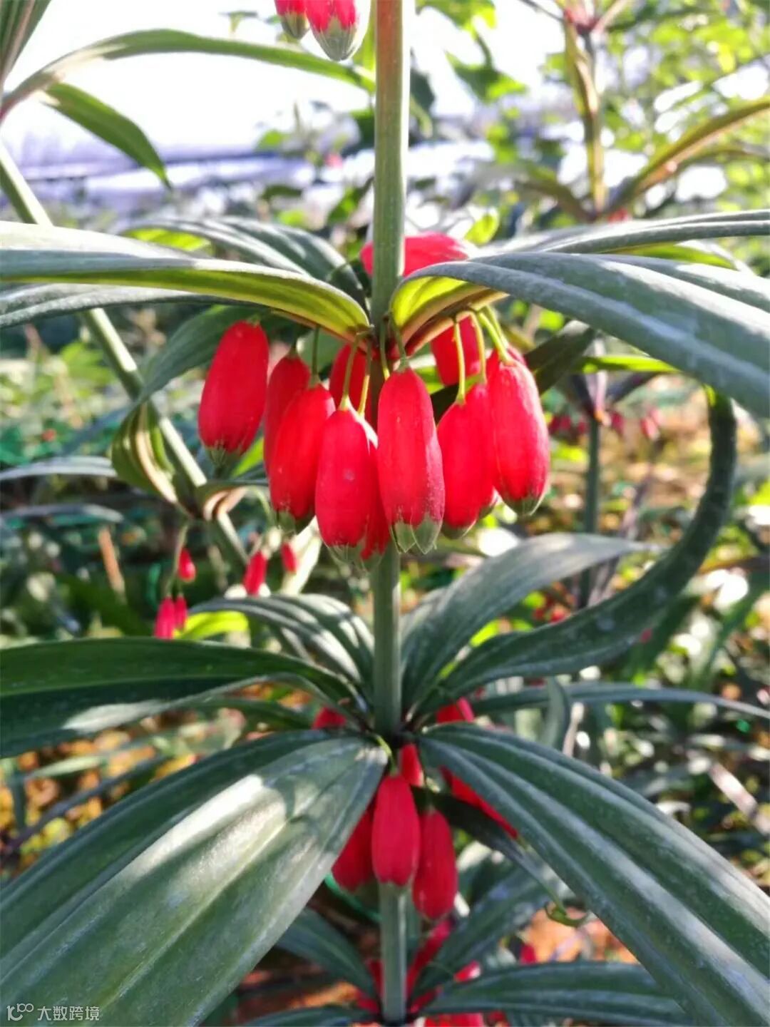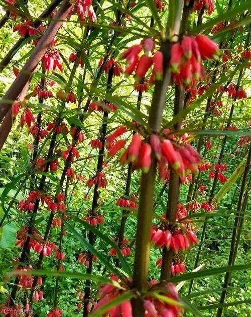 叶互生,基生叶轮生,叶尖下垂,长36mm,宽420mm,叶脉13片,先端拳卷或卷钩状,花59朵,伞状排列,花梗长23cm,下垂,花冠钟状,多为黄红色略带黑色圆斑,全长810mm。