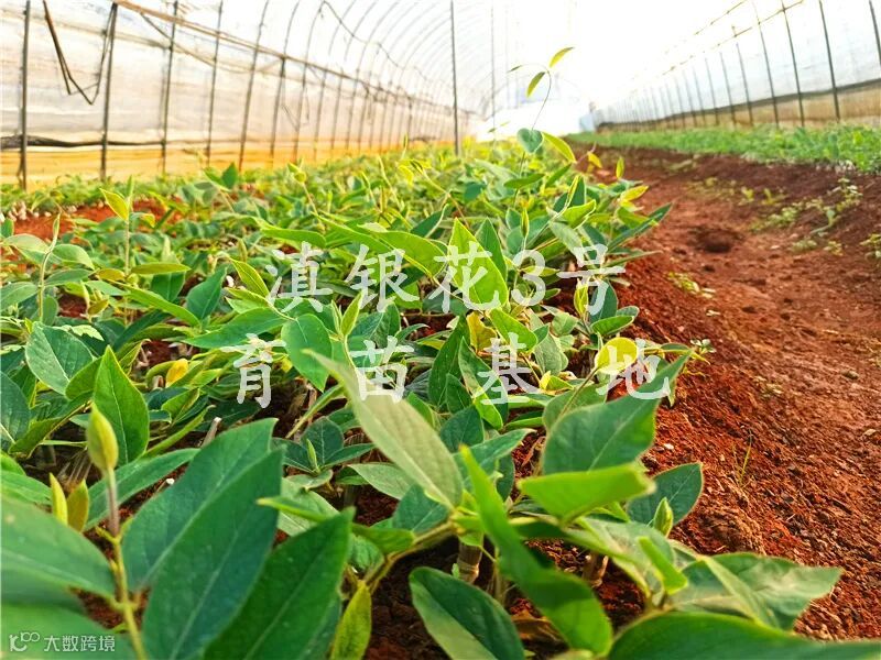 树型金银花从形态上与传统品种比较,把传统藤本培育成树形的小乔木,叶大、厚、顶部尖毛多,花大、花壁厚,徒长枝少,大多裸芽也为短花枝,大水大肥也不徒长枝蔓;节间短,多数从第一节间开花,直立度与地面成45度角;生长快,50天可长到0.5cm粗;采收省工,产量是传统品种的2-4倍。英武农业历时6年成功培育的“滇银花3号”具有极高的经济性状,花蕾硕大,花针长,花蕾中绿原酸含量等有效成分大幅提高。每亩种植只需用苗200株。花期从每年5月底至6月底,在云南种植可在9月中旬左右产第二次花,当年种即可开花,第二年产量可达50-100kg,三年后亩产可达200公斤以上干花,亩产效益可达万元以上。