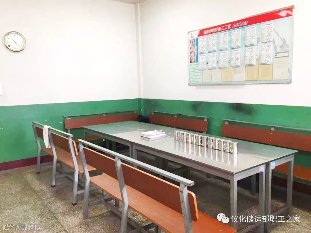 班组候工室桌面上职工们放置的茶杯整齐划一,受到储运部其它班组齐声称赞。