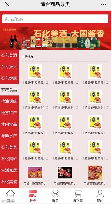 石化员工团购网自从为员工开展团购活动以来,总计组织过上万款产品的团购,目前正在团购的产品有2300种,主要类别有石化美酒、乡村振兴、石化健康、节庆食品、粮油调味、地方特产、休闲食品、海鲜水产、石化美茗、石化美砂、石化美装、汽服产品、生活家居、生活家电、石化美妆、石化好书等。