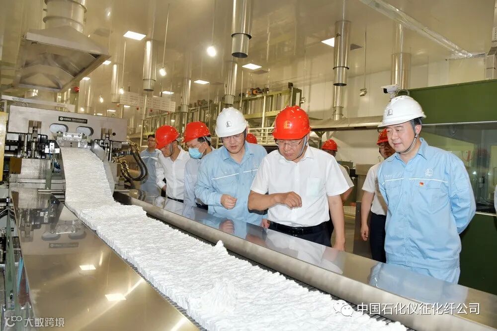 年产20万吨熔体直纺环保型短纤项目,是公司聚焦提质增效升级、推进产品结构调整、做强医疗卫生材料的重点项目。在项目现场,张玉卓一行察看了洁净化厂房、后纺生产线和自动打包机等,万涛向张玉卓汇报了项目装备技术、建设进展、8条纺丝生产线分步开车、已有4条纺丝生产线正在试生产等情况。