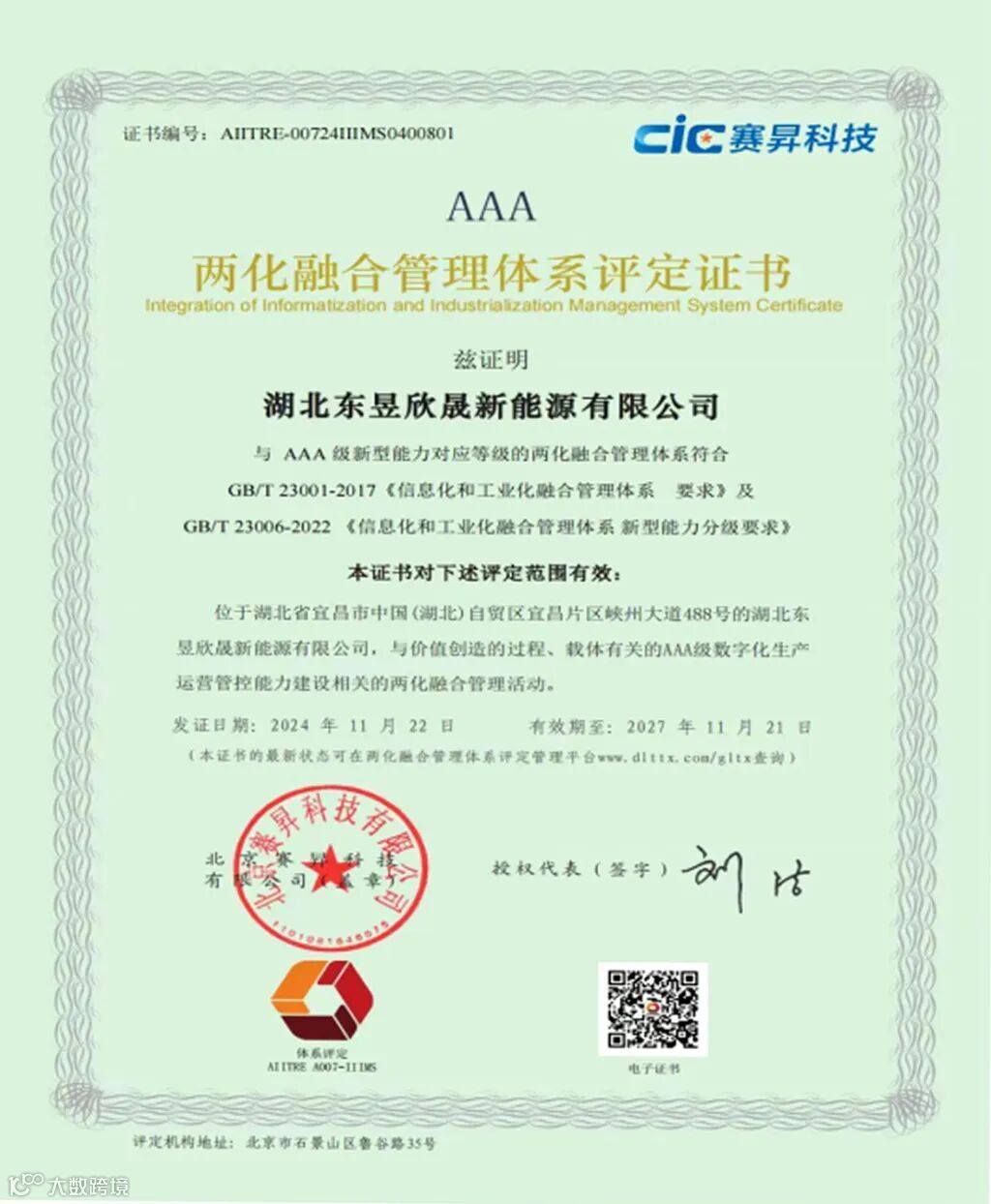 2024年11月22日,湖北东昱欣晟新能源有限公司迎来了历史性的一刻——成功荣获国家工业和信息化部颁发的两化融合管理体系AAA级认证。这一殊荣不仅标志着东昱欣晟在信息化与工业化深度融合的进程中取得了重大突破,更意味着东昱欣晟在企业数字化转型和高质量发展的道路上迈出了坚实的步伐。