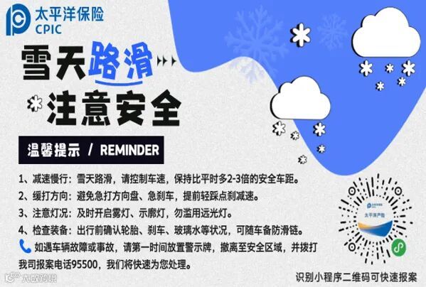风雪无情,服务有温。太平洋产险将持续强化灾害预警与理赔响应,恪守“省心、放心、安心”的服务承诺,以科学的风险防范、专业的理赔服务、暖心的人文关怀,切实守护每一位客户的出行平安与财产安全,最大限度降低灾害损失,在风雪之中传递太保的坚实守护与安心相伴。