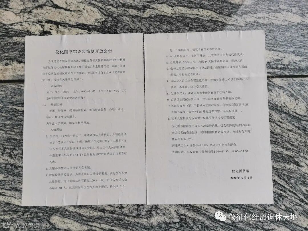 为满足读者朋友阅读需求,根据江苏省文化和旅游厅《关于精准有序做好文化场馆恢复开放工作的通知》和上级部门统一部署,结合我市疫情防控情况和本馆工作实际,仪化图书馆自6月6日起逐步恢复开放,现将有关事项公告如下: