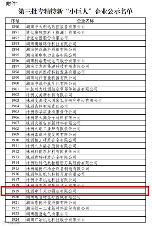 喜报 | 株洲控股旗下天力锻业成功入选国家专精特新“小巨人”企业