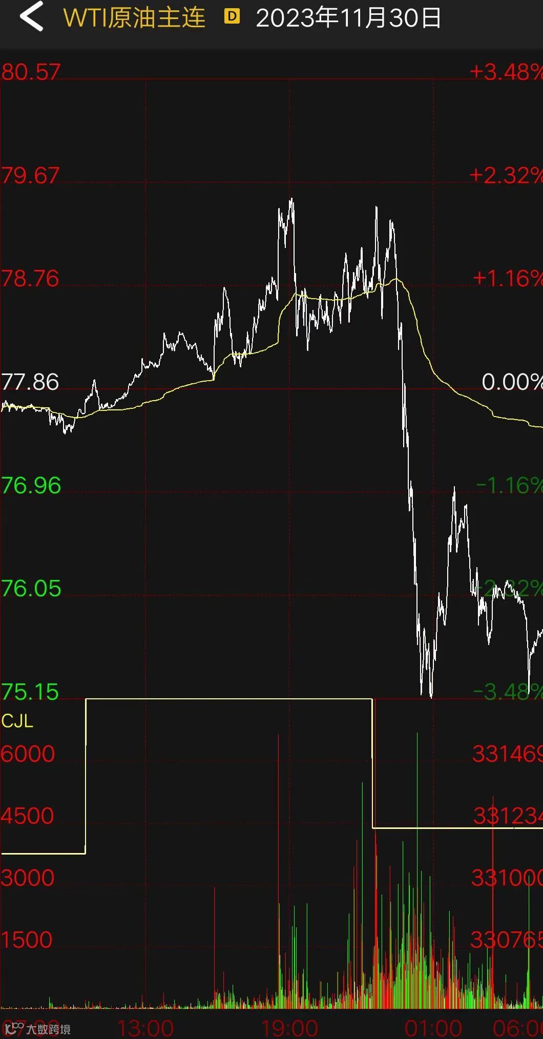 OPEC+同意进一步削减供应的消息出来后,WTI原油期货盘中涨幅扩大至2%。不过,市场担忧OPEC+“自愿”减产的约束性有限,具体执行恐不及纸面规模,油价走势大逆转,盘中转跌且跌幅一度超过3%。截至当天收盘,WTI原油期货主力合约收于75.96美元/桶,跌幅为2.44%;布伦特原油期货主力合约收于80.86美元/桶,跌幅为2.4%。