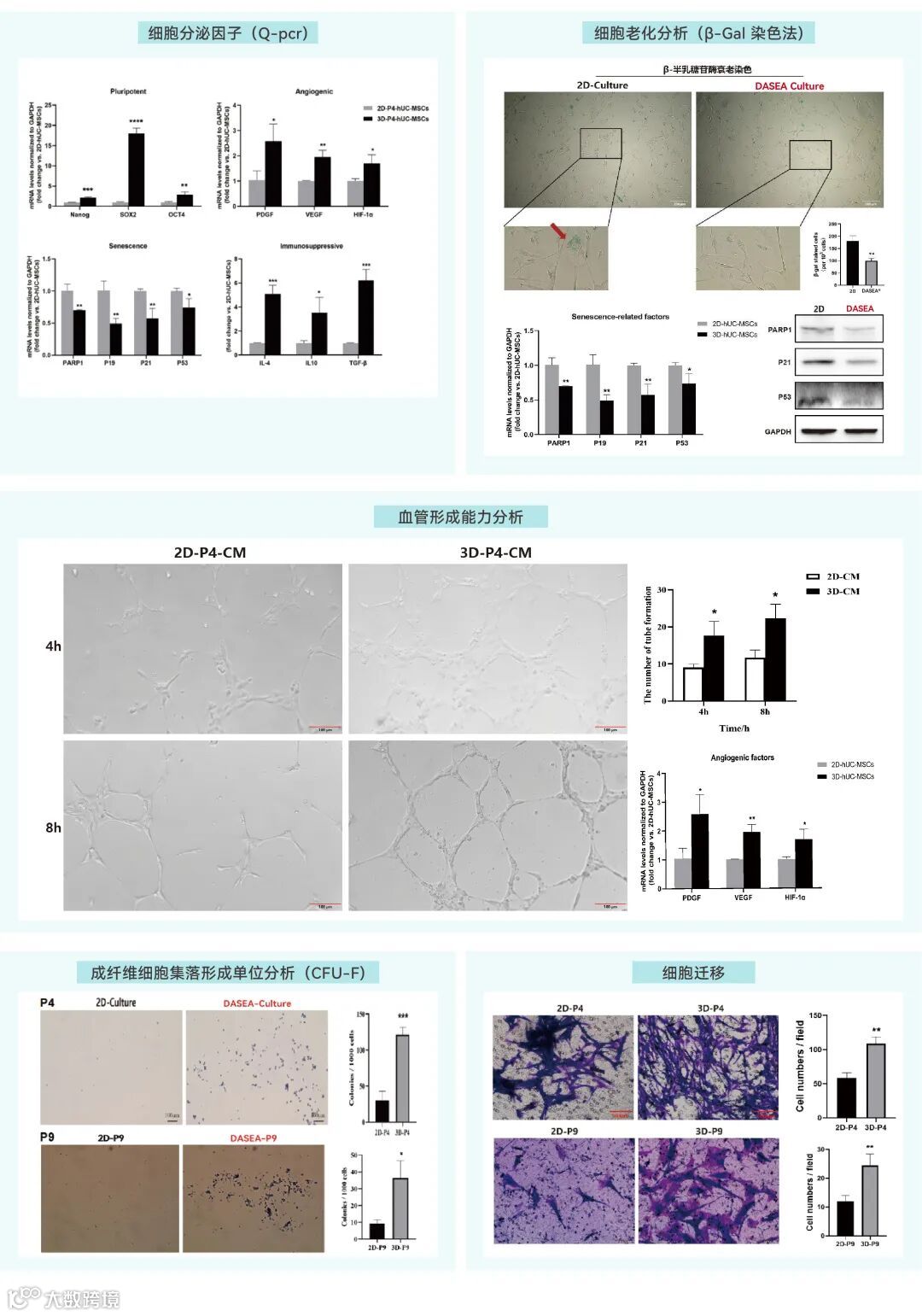 对DASEA平台智造的干细胞制剂的质量进行对比研究,包括基本生物学属性、生物学安全性、微生物学安全性和生物学有效性的评估。结果显示,DASEA平台的三维培养技术在多个方面都优于传统的二维培养方法。