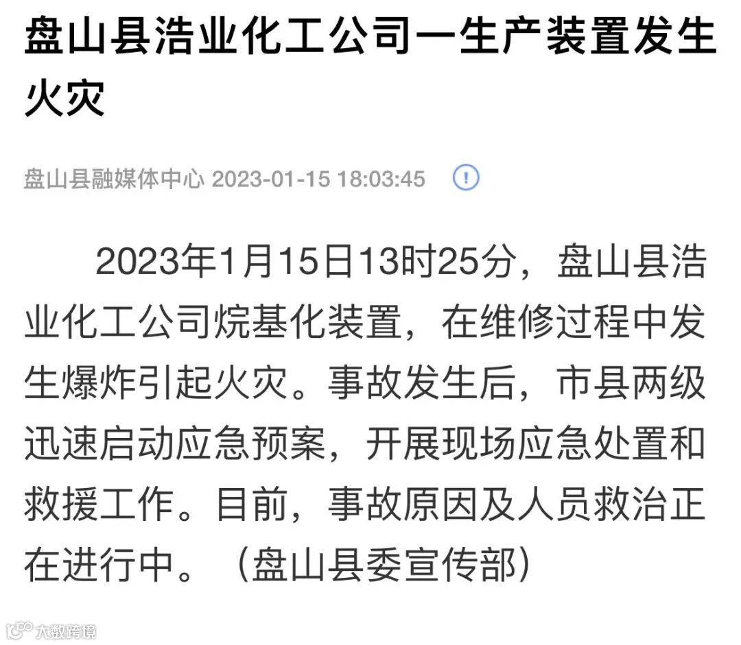 2023年1月15日13时25分,辽宁盘锦市盘山县浩业化工公司烷基化装置,在维修过程中发生爆炸引起火灾。事故发生后,市县两级迅速启动应急预案,开展现场应急处置和救援工作。目前,事故原因及人员救治正在进行中。