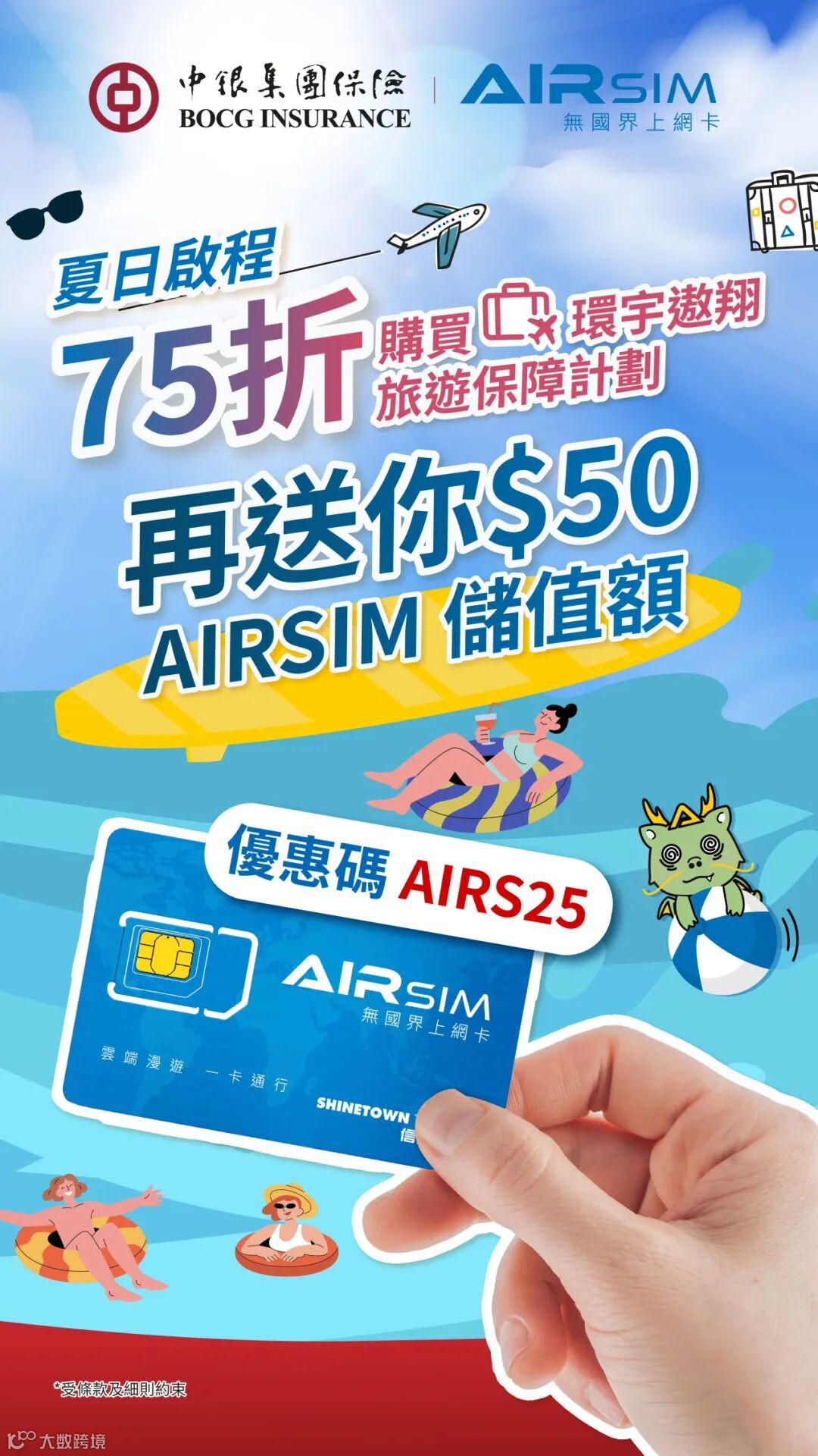 中銀集團保險首次與AIRSIM聯乘合作,在暑假期間,推出75折旅遊保,再送您AIRSIM 50港元儲值額!由即日起至2024年9月15日,首2,000名成功投保「環宇遨翔旅遊保障計劃」之客戶,可免費獲得AIRSIM 50港元儲值額!名額2,000,先到先得,送完即止!